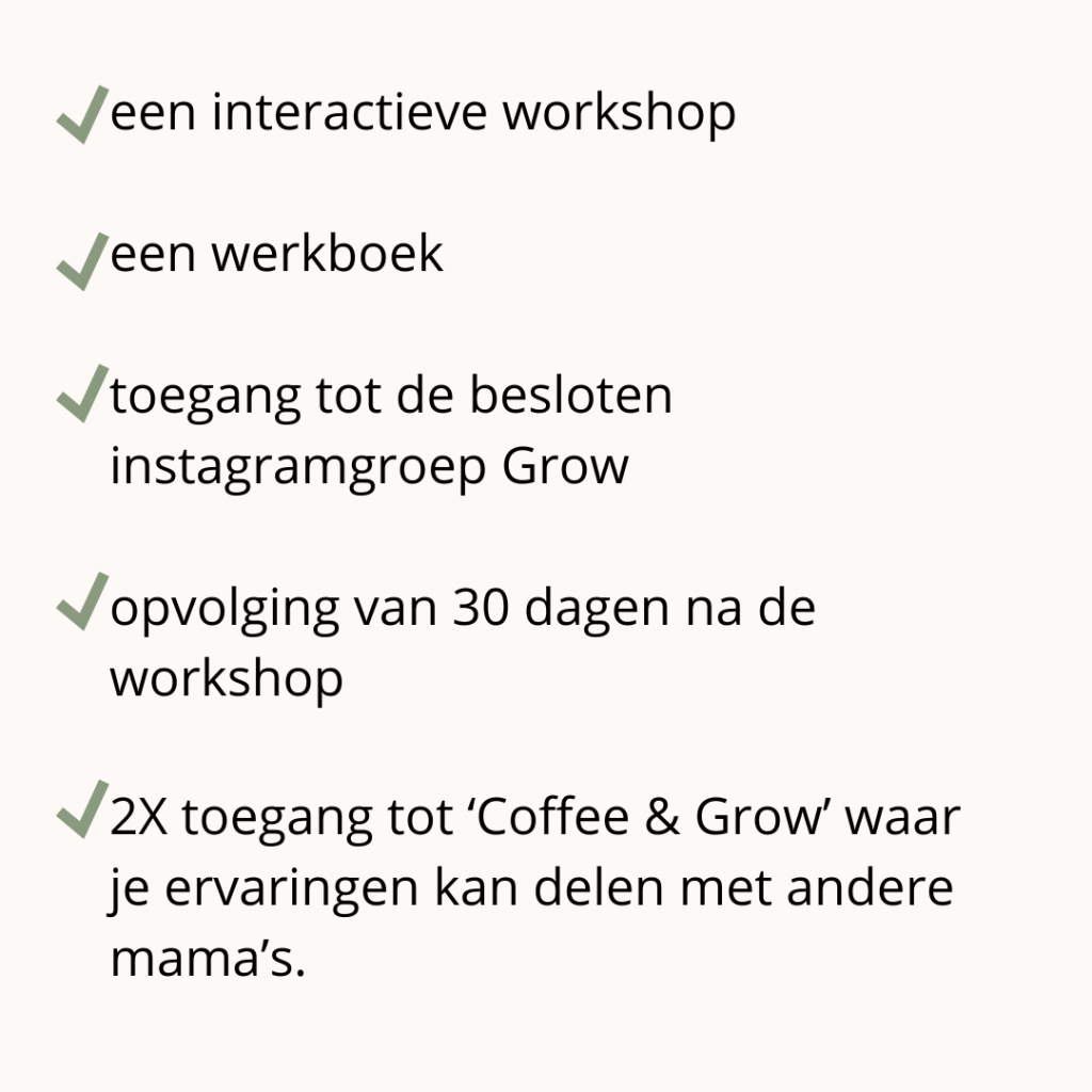 Wie deelneemt aan een workshop krijgt 2x toegang tot Coffee & Grow. De manier om andere mama’s te leren kennen en ervaringen te delen samen met een hapje en drankje.