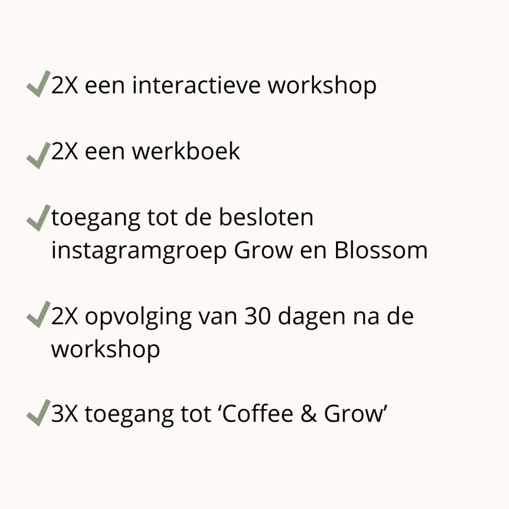Tijdsduur: 2u + Coffee&Grow (26/4-31/5)